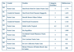 Según el número de habitaciones, la primera posición corresponde al Hard Rock Hotel & Casino Punta Cana. Le sigue el Hard Rock Hotel Panamá Megapolis, Barceló Bavaro Palace Deluxe, Hotel Royal Decameron, Meliá Caribe Tropical, Riu República, Occidental Grand Flamenco Punta Cana, Now Larimar Punta Cana, Be Live Collection Punta Cana y el Bávaro Princess All Suites Resort, Spa & Casino.