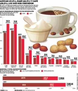 Las ventas al exterior alcanzaron US$1.013,2 millones en los primeros cuatro meses del año, en comparación con US$817,9 millones en el mismo período de 2016. Se han visto aumentos en todos los productos tradicionales como el café oro, carne bovina, azúcar de caña, maní y frijoles.