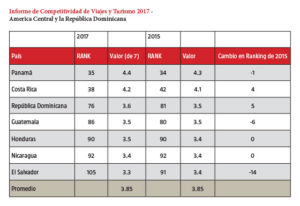 La República Dominicana ocupa el tercer lugar en el ranking regional, superando a Guatemala, al mismo tiempo que sube de 81 a 76 en el ranking mundial. Dominicana obtiene altas puntuaciones en el indicador “priorización en viajes y turismo”, pero necesita mejorar su sostenibilidad ambiental. Guatemala ocupa la cuarta posición en América Central, aunque experimento una disminución de seis posiciones en el ranking mundial al pasar de 86 a la 80.
