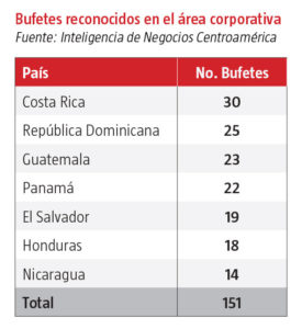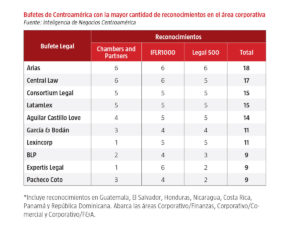 AméricaEconomía Centroamérica realizó una investigación de los bufetes legales reconocidos por Chambers and Partners, Legal 500 e IFLR1000. Los resultados indican que en Centroamérica y República Dominicana, el 74% de las firmas legales que cuentan con reconocimientos por alguna de las tres organizaciones se distinguen en el área corporativa.