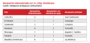 Centroamérica y República Dominicana dispone de 23 aeropuertos internacionales. De estos, nueve tienen terminales de carga habilitados. República Dominicana posee 8 aeropuertos. La región cuenta con 64 puertos y terminales marítimas, de estos 35 están en el Atlántico y 29 en el Pacífico.