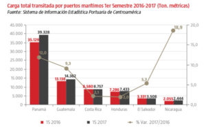 Según el Sistema de Información Estadística Portuaria de Centroamérica, el total de carga transitada por los puertos marítimos en Centroamérica en el primer semestre 2016 fue de 69.519 toneladas métricas y 75.832 toneladas métricas en 2017, un aumento interanual de 6.313 toneladas métricas. El país que aumentó considerablemente su variación en carga fue Nicaragua con un incremento de 18,9%, de 2.055 toneladas métricas en los primeros seis meses de 2016 a 2.444 toneladas en el mismo período de 2017.