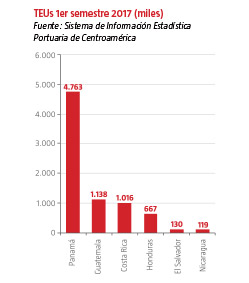 Respecto a la cantidad de contenedores procesados entre enero y junio de 2017, Panamá es el líder indiscutible de la región con 4,76 millones de TEUs. Distantemente le sigue Guatemala con 1,13 millones de TEUs, Costa Rica con 1,01 millones, Honduras con 667 mil TEUs, El Salvador con 130 mil y Nicaragua con 119 mil TEUs.