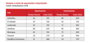 El costo de importar es más alto en República Dominicana con US$579, US$490 en Panamá, US$483 en Honduras, US$420 en Costa Rica, US$405 en Guatemala, US$400 en Nicaragua y US$128 en El Salvador. Respecto al tiempo de cumplimiento fronterizo de las importaciones, es de 96 horas en Honduras, 80 en Costa Rica, 72 horas en Nicaragua y Guatemala, 36 en El Salvador, y 24 horas en Panamá y República Dominicana.